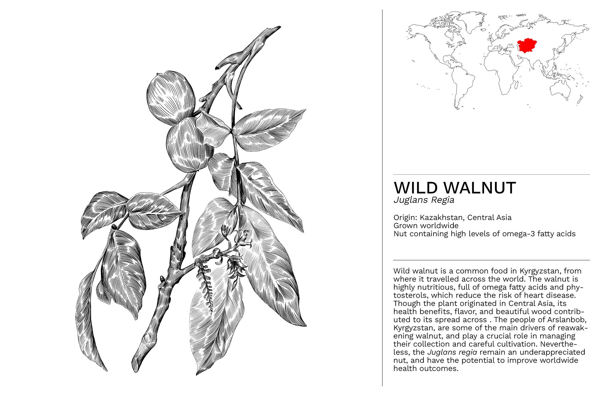 WILD WALNUT IS A COMMON FOOD IN KYRGYZSTAN, FROM WHERE IT TRAVELLED ACROSS THE WORLD. The walnut is highly nutritious, full of omega fatty acids and phytosterols, which reduce the risk of heart disease. Though the plant originated in Central Asia, its health benefits, flavor, and beautiful wood contributed to its spread across . The people of Arslanbob, Kyrgyzstan, are some of the main drivers of reawakening walnut, and play a crucial role in managing their collection and careful cultivation. Nevertheless, the Juglans regia remain an underappreciated nut, and have the potential to improve worldwide health outcomes.